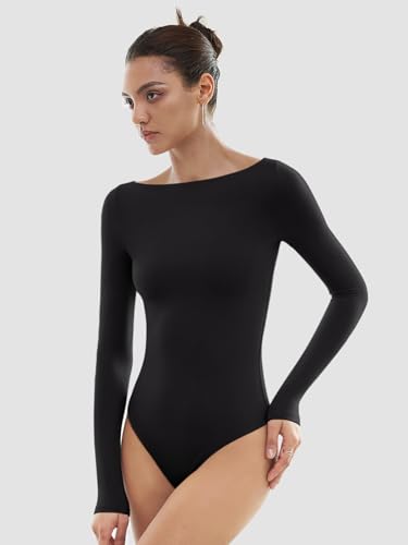 REORIA Women’s Sexy Basic Boat Neck Long Sleeve Body Suits Double Lined Seamless Slimming Fall Trendy Going Out Thong Bodysuit tops Black Medium