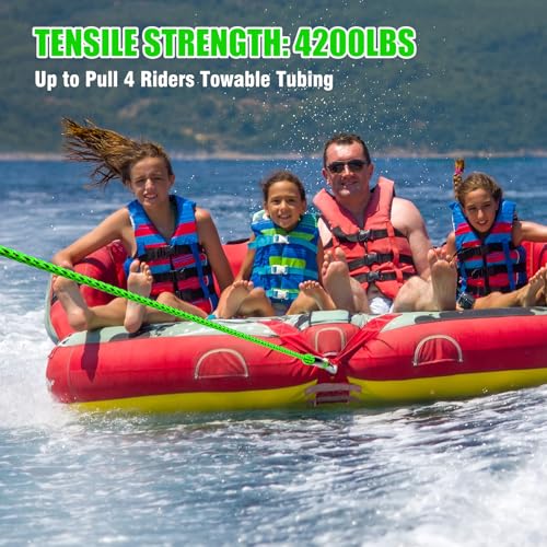 Click for More Images PERFECT FOR 1-4 PERSON TOWABLE TUBES: Built with a tensile strength of 4,200lbs, this 60 FT heavy-duty boat tow rope for tubing is designed to pull up to 4 riders towable tubes for boating.HIGH-VISIBILITY FLOATING DESIGN:...