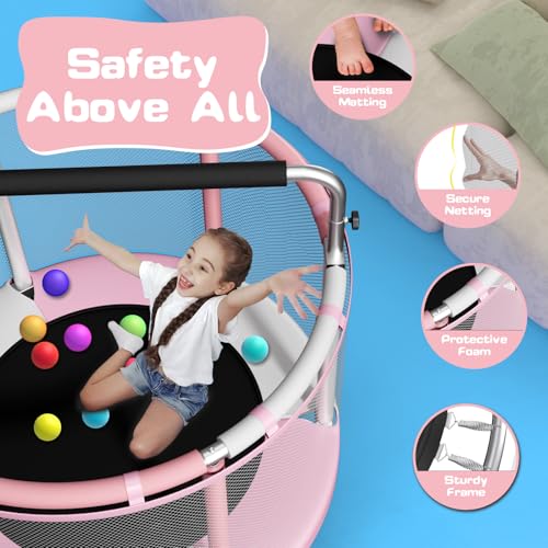 Click for More Images Safe & Sturdy - Indoor trampoline for kids is built to last, with a thickened steel frame, 3 U-shaped legs with non-slip suction pads, and a 360° wrap-around safety pad. Plus, with dense safety netting and upgraded foam,...