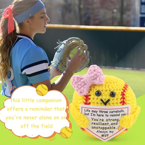 Click for More Images Cute & Uplifting Design: With bright yellow yarn, classic red stitches and a sweet pink bow, this handmade softball holds a motivational home-plate-shaped card that reads: “Life may throw curveballs, but I’m here to...