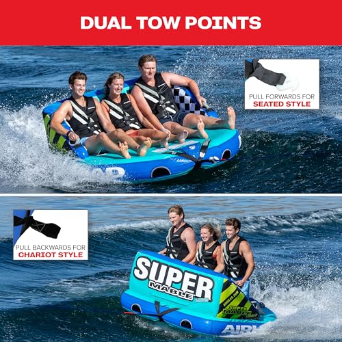 Click for More Images Airhead SUPER Mable, 1-3 Rider - Inflatable Towable Tube for Boating and Water Sports, Heavy Duty Full Nylon Cover & Zipper with EVA Foam Padding, Easy Inflating & DeflatingEVA Padding: Comfy foam pads that make your ride...
