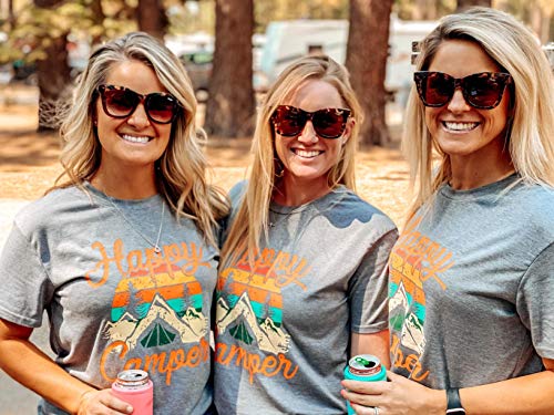 Happy Camper Shirt for Women Funny Cute Graphic Tee Short Sleeve Letter Print Casual Tee Shirts (Gray,L)
