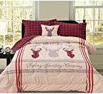 4-Piece Hunting Fishing Canoeing Queen Comforter Bedding Set with Throw Pillow, Deer Rustic Lodge Buffalo Check Plaid Tan Red Grey