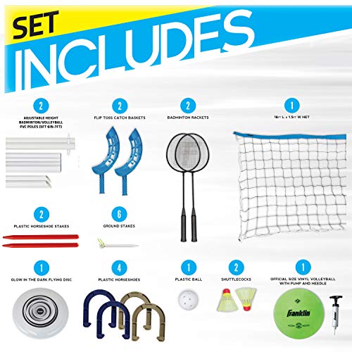 Click for More Images Family fun: This combo set includes 5 outdoor games for hours of fun. Test your skill with Badminton, Volleyball, Flip Toss, Horseshoes and a Flying DiscNet: 20' x 1.5' x 4" size. PVC poles are 3/4" and are adjustable in...