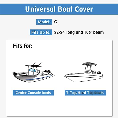 Click for More Images ?Universal Fit? The cover size is 30.2' x 224.4'' and fits boats in the 22-24' long and 106'' beam size range. Universal for most center console boats and T-top/Hard Top boats.?Weatherproof Material? Durable 600D...