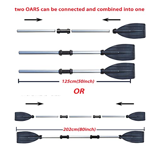 Click for More Images Two 50" Canoe oars. 80"Combo paddle creates single paddle for kayak, double boat oarsEasy 3 piece assembly. Lightweight & aesthetically appealing,connect the two paddles together for combined useRibbed blades for durability...