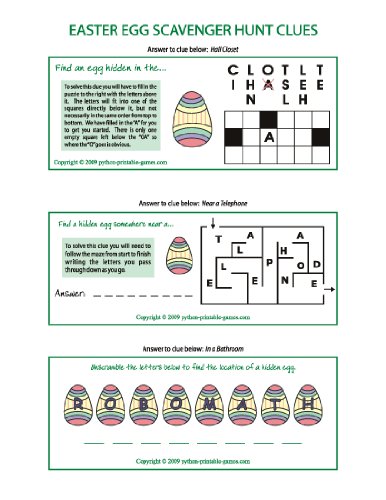 Click for More Images A fun and varied Easter Egg hunt gameSuitable for elementary school kidsIncludes logic and reasoning testsPrint as many copies as you needPlays with a single child or many kids More Information...