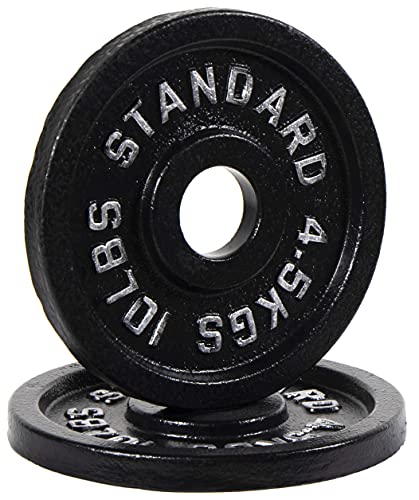 Click for More Images Made of solid cast iron with a 2-inch center hole fits any Olympic bar with diameter 2” or less; Can be used with 2” dumbbell bars tooAll plates features a durable, black baked enamel finish to prevent the plates from...