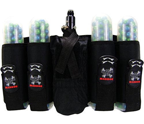 The black Maddog Sports 4+1 Vertical Paintball Harness is uniquely designed to give you immediate access to all your most-used paintball supplies, including four standard 140-round pods and a single 88/4500ci tank (pods and tank sold separately)....