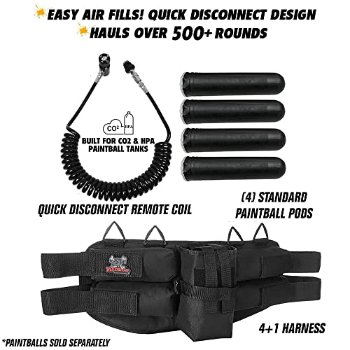 Click for More Images Perfect Paintball Accessory Combo for Your Paintball Gun! Kit Includes: 4+1 Paintball Harness, (4) Standard Paintball Pods, & Standard Quick-Disconnect Remote CoilQuick Disconnect Remote Coil gets the Bulk Weight of the Tank...