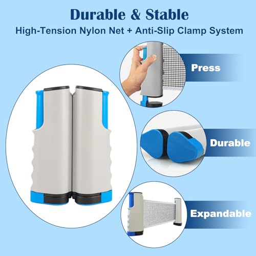 Click for More Images RETRACTABLE PING PONG NET: With our table tennis net, you no longer need a standard-sized table tennis table. Its adjustable net length can transform any table into a ping pong table, allowing you to enjoy the fun of table...