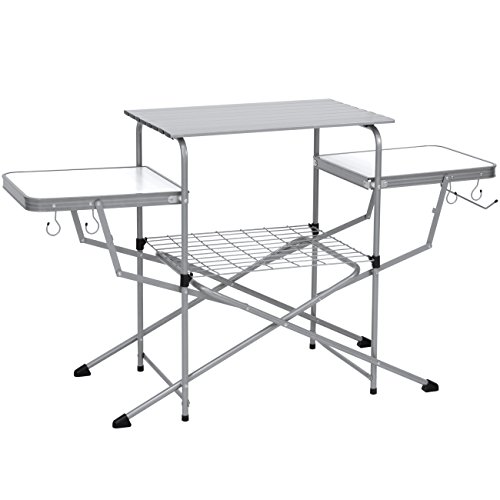 Specifications:Overall Dimensions: 56"(L) x 19"(W) x 32"(H)Center Table: 26"(L) x 18"(W)Side Table: 17.5"(L) x 16"(W)Bottom Rack: 22"(L) x 19"(W)Bottom Rack to Center Table: 15.5"(H)Weight Capacity: 66 lbs.Weight: 15.9 lbs.Material: Aluminum,...