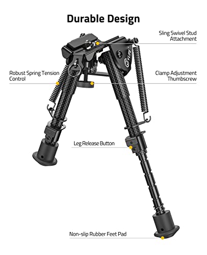 Click for More Images Made of strong and lightweight(8.8oz) carbon fiber, this bipod is resistant to high temperature,corrosion and friction.Spring loaded legs make it easy to deploy and provide a steady support.Press the button, the legs can...