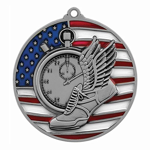 Click for More Images PREMIUM QUALITY MEDALS; this Track & Field medallion is built to last and will hold up even with robust handling; features a hand painted, red, white and blue background of the stars & stripes; a 3D winged pair of running...