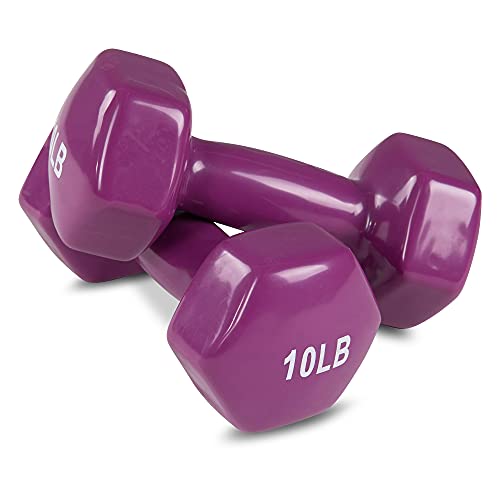 Click for More Images 10 pound dumbbell (set of 2) for exercise and strength trainingSteel with vinyl exterior in Purple for lasting durabilityHexagon shaped ends prevent rolling away and offer stay-in-place storageNon-slip grip and contoured...