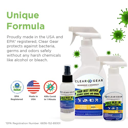 UNIQUE FORMULA – Proudly made in the USA and EPA registered, Clear Gear protects against bacteria, germs and odors safely without any harsh chemicals like alcohol or bleach. Clear Gear is a water based formula that has a low toxicity rating and is non-corrosive to surfaces.