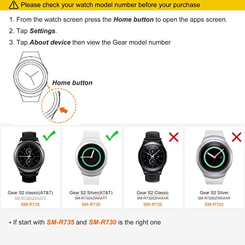 • Compatible Model:Samsung Gear S2 3G R730 and Gear S2 Classic and Gear S2 Sport R735 and Gear Sport SM-R600 all carrier ATT, Verizon, Sprint etc.