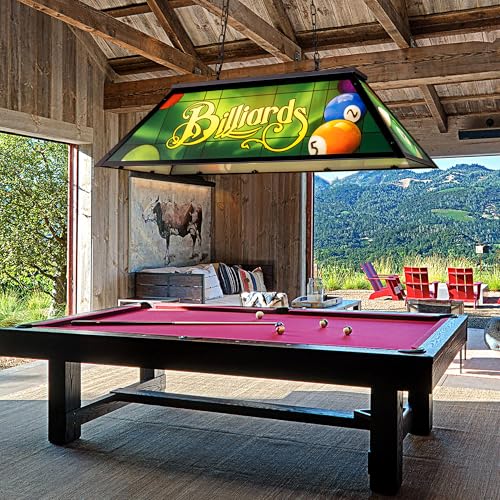Click for More Images Game Themed Pool Table Light: The billiard light shade replicates the classic green texture of the billiards table, paired with iconic elements such as a number 14 ball and handwritten "Billiards" lettering, instantly...