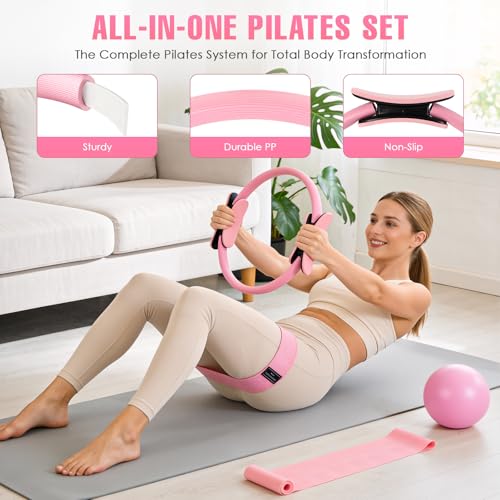 Complete 14-in-1 at Home Pilates Kit: Pilates equipment set is your all-in-one home fitness solution. This full home Pilates kit includes a 12″ Pilates ring, a 9.8″ pilates ball (with pump), 4 levels resistance bands (10 /15 /20 /35 lbs),an ankle resistance bands with cuffs, a levels stretch bands, a figure 8 resistance band, a massage balls, grip socks, a storage bag and a detailed workout guide. Everything you need to start.Get our complete Pilates kit-convenience, value, and nothing missing.