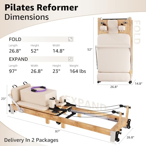 Pilates Reformer Machine, 97″ L Foldable Studio Grade Pilates Equipment for Gym and Home, Oak Wood Pilates Reformer with Versatile Reformer Accessories