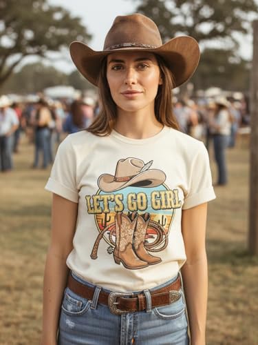 • Design: Show off your independent spirit with our eye-catching western design! Featuring detailed cowboy boot prints and the empowering “Let’s Go Girl” text, this shirt combines classic western charm with modern feminine energy. The vibrant, durable print won’t fade or crack, ensuring your style stays fresh.