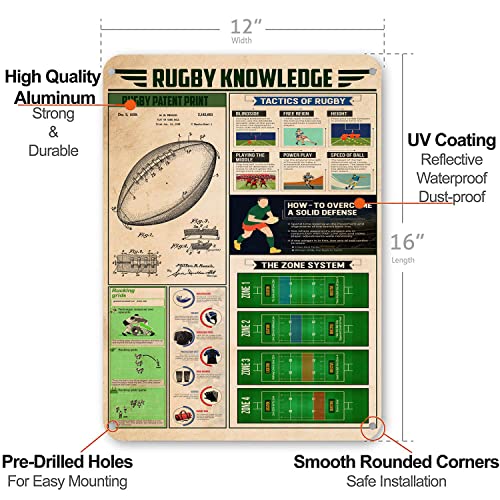 NEGLAI Rugby Knowledge Metal Signs Poster, Football Bar Club Wall Decor Farmhouse Man Cave Pub Decorations 16×12 Inches