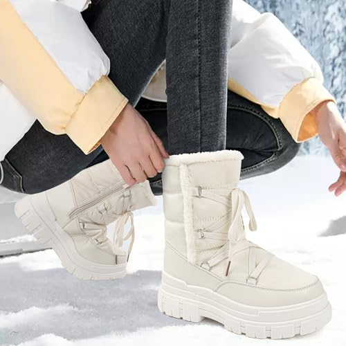 Snow Boots for Women Waterproof Winter Boots – Warm Insulated Mid Calf Boots with Faux Fur Lining, Lace-Up and Side Zipper – Non-Slip Thick Sole Womens Snow Shoes, Botas de Nieve para Mujer – White,11