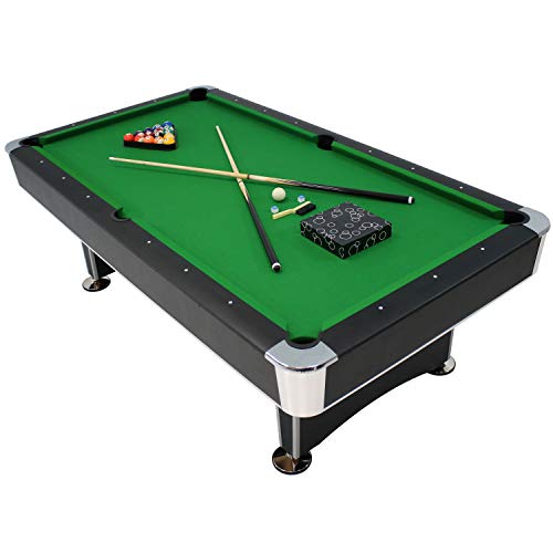 - Perfect pool table for the den, family room or rec room- MDF, plastic and metal construction- Includes 1 pool table, 1 triangle, (2) 57.75" cues, 2 chalk cubes, 1 brush and 1 ball set- Green playing surface- Leveling feet help make games more...