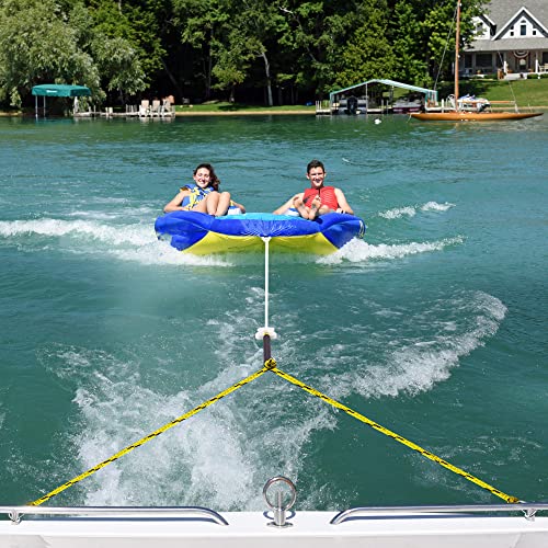 ? Heavy Duty: Our tow harness is made from 16 strands of PE polyethylene, 1/2 inch diameter, up to 4800 lbs tensile strength to support 4 Rider towable tubes.