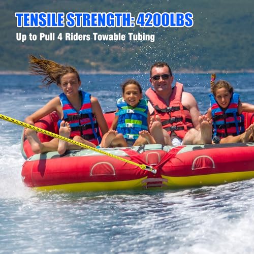 PERFECT FOR 1-4 PERSON TOWABLE TUBES: Built with a tensile strength of 4,200lbs, this 60 FT heavy-duty boat tow rope for tubing is designed to pull up to 4 riders towable tubes for boating.